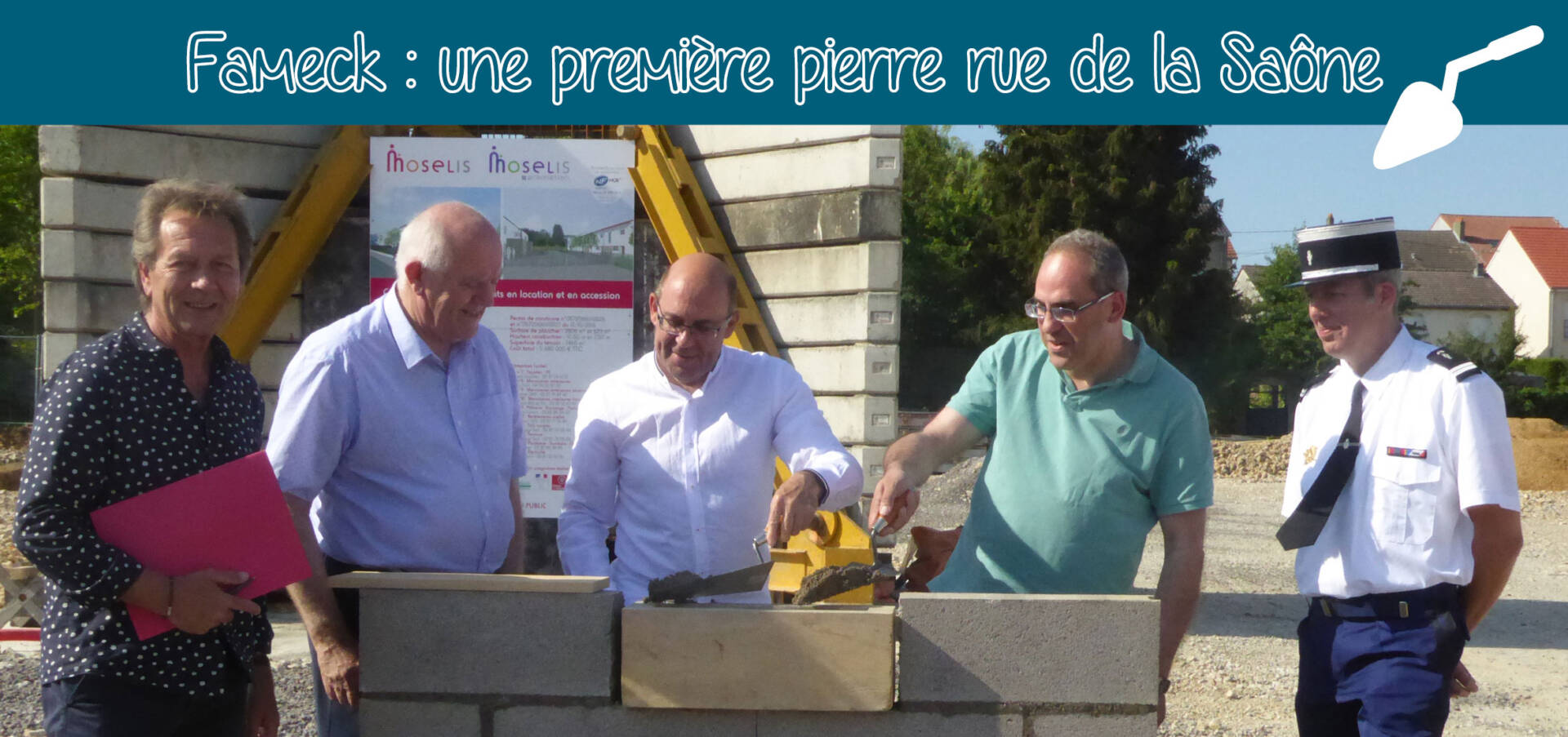 Notre programme mixte de 51 logements, rue de la Saône à Fameck (Clos du Moulin), est officiellement lancé ! La première pierre a été posée début juillet par (de gauche à droite sur la photo) Eric Michel et Claude Bitte, respectivement Directeur Général et Président de Moselis, Michel Liebgott, Maire, Brahim Hammouch, Député de la Moselle, et le Lieutenant Sébastien Janot, commandant de la brigade de gendarmerie.