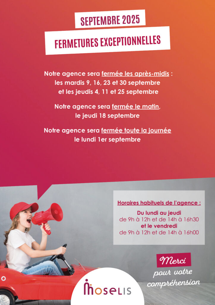 Nous vous informons que l’agence connaîtra plusieurs fermetures exceptionnelles au cours du mois de septembre, nous vous invitons à prendre en compte ces adaptations ponctuelles de nos horaires d’ouverture.