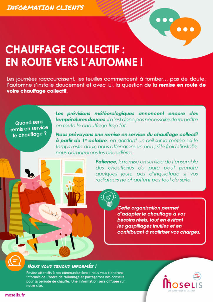 Les prévisions météorologiques annoncent encore des températures plutôt douces. Inutile donc de rallumer trop tôt : la remise en service du chauffage collectif est envisagée à partir du 1er octobre, en fonction de l’évolution de la météo.