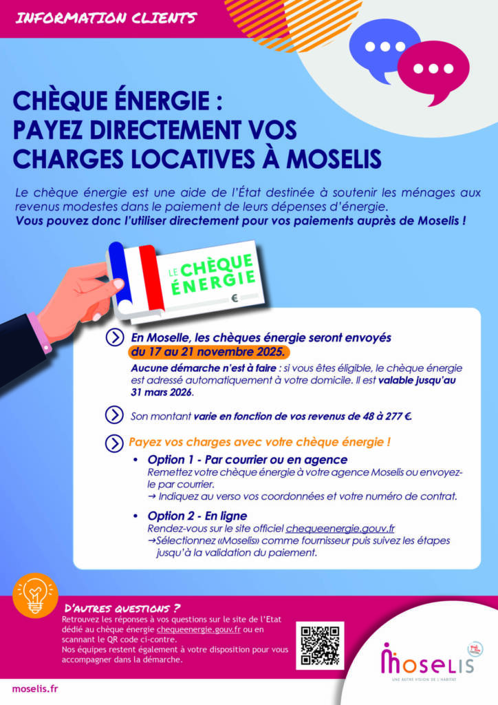 Bonne nouvelle ! Le chèque énergie, aide de l’État pour soutenir les ménages aux revenus modestes, peut être utilisé pour payer vos charges locatives auprès de Moselis 🏡.